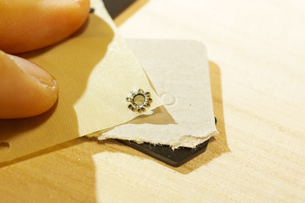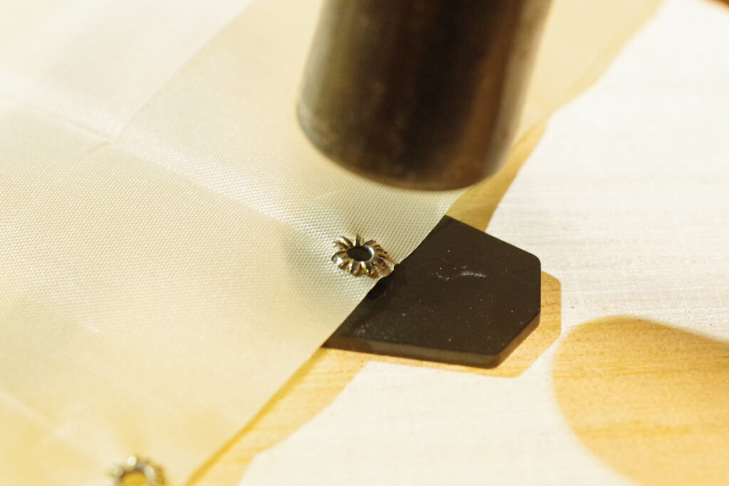 とても小さなハトメでカワイイですね!でも、それはつまり落とすと悲劇。探し出すのに製作以上の時間がかかります。袋や皿に入れておきましょう!