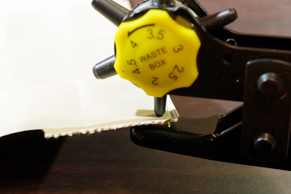 布に厚紙を重ね、レザーパンチで穴を開けます。
