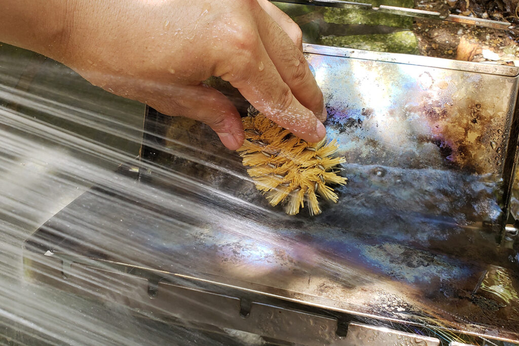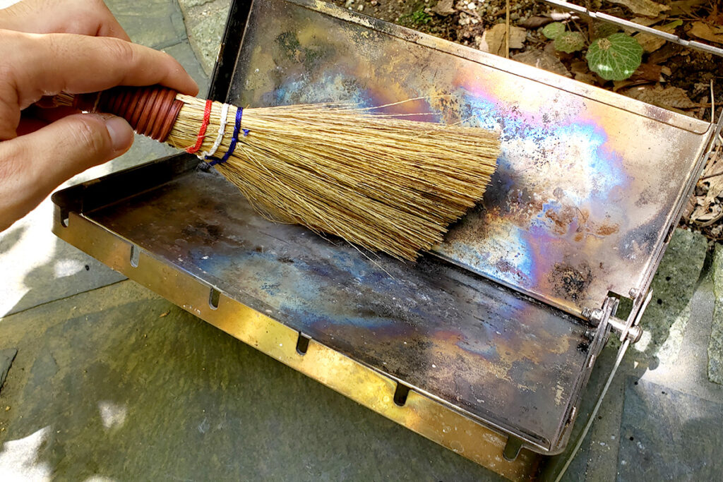 手箒を使い、焚き火台の隙間やボルトなどに残っている灰を払います。