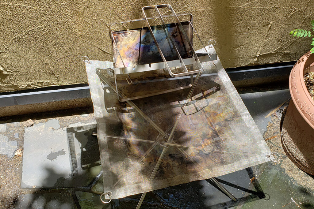 メッシュ焚き火台のほうはパッと見て分かりにくいかもですが、メッシュに穴につまった灰が落ちました。