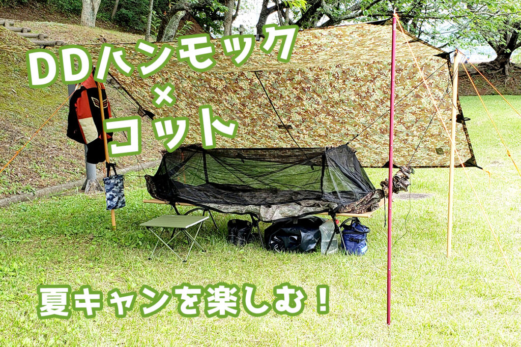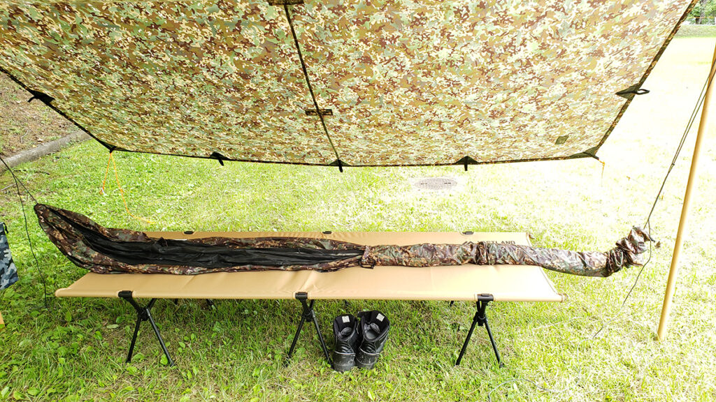 タープさえ設営してしまえば、コットとハンモックの合体は簡単です。使用感もいいので、DDハンモックをどうしても使いたいという不思議な人…こだわりのある人にはオススメです。