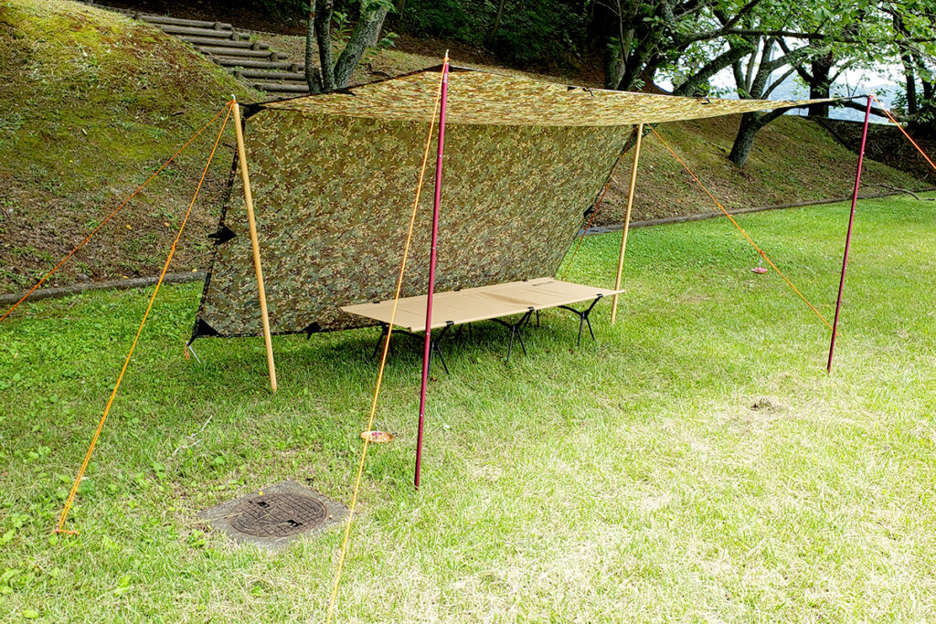 タープとポールでAフレームを作ります。メインポールの高さは約150cm。今回はサブポールも使い、前室を広く取っています。