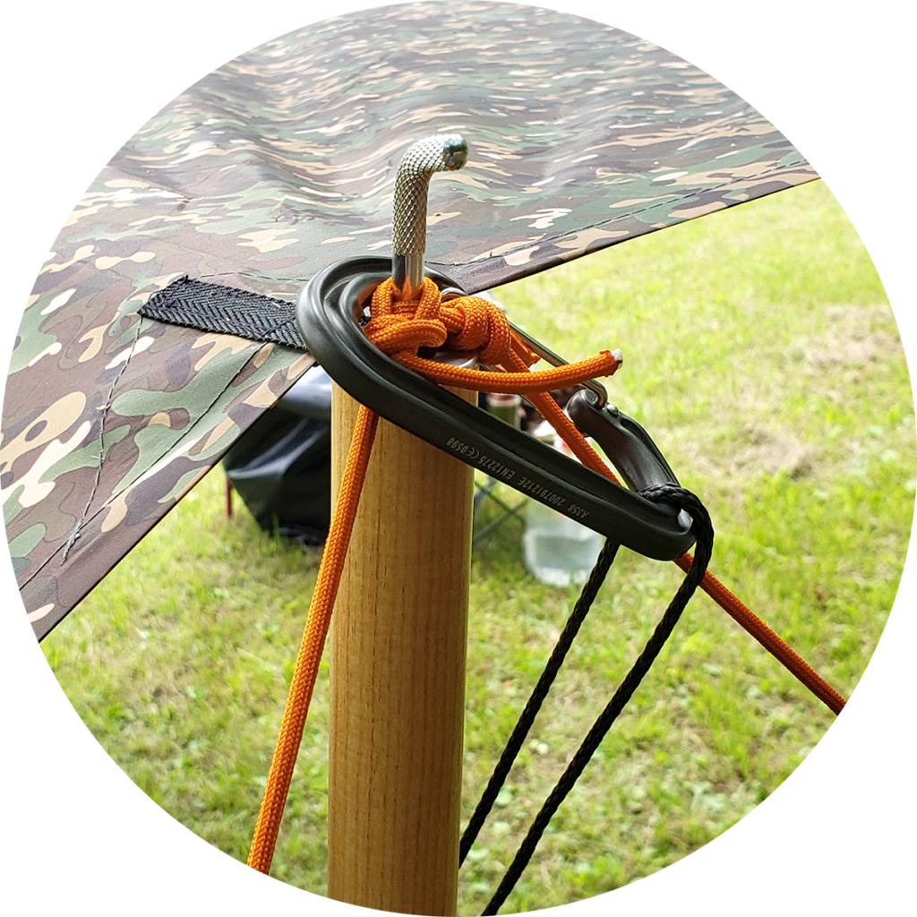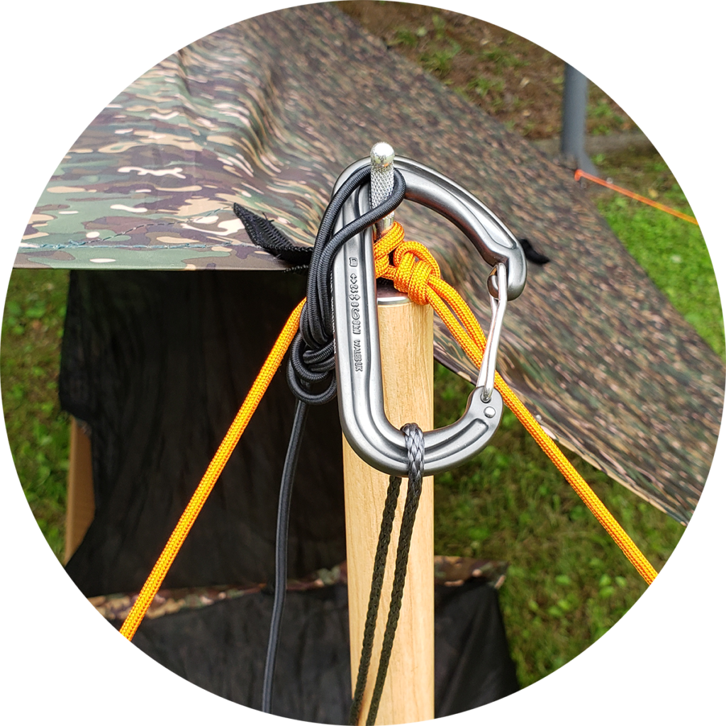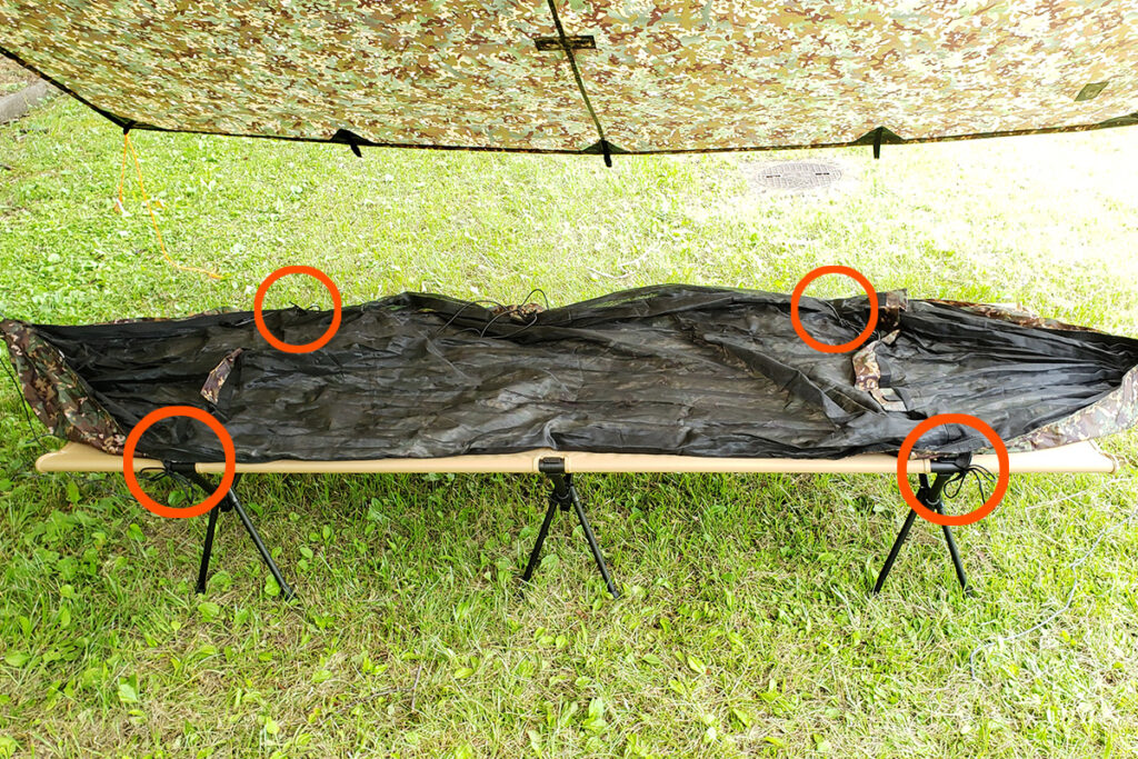 DDハンモックには、外側に4つのループがついています。それと、コットのポールがむき出しになっている部分とを結びます。紐は40cmくらいあれば十分です。