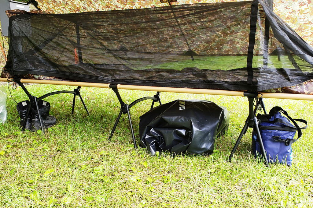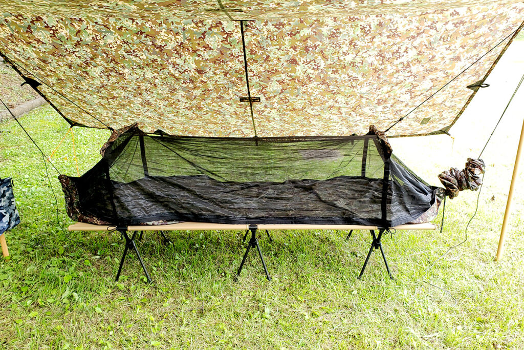コットでタープ泊もよさそうだけど、虫が心配。そこで考えたのが、コットにハンモックを取り付けて蚊帳に使えないか?でした。