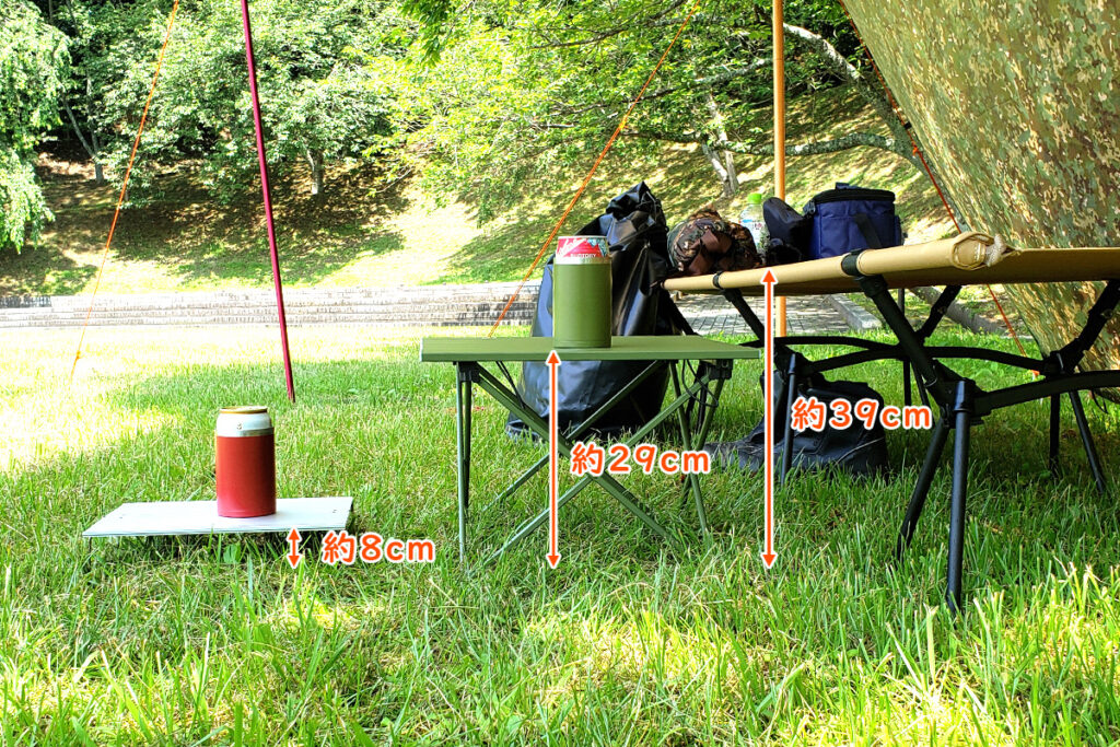 高さは、「SOTO フィールドホッパー ST-630」は約8cm。「Moon Lence アルミローテーブルS」は約29cm。「VASTLAND 2WAY キャンプコット」はハイコットで約39cmでした。