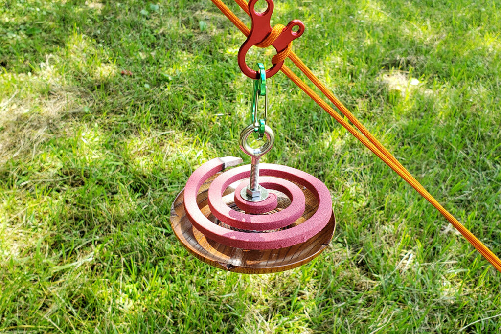 地面に置くのはもちろん、カラビナをつければ、ロープや立木などに吊るすことができるようになります。