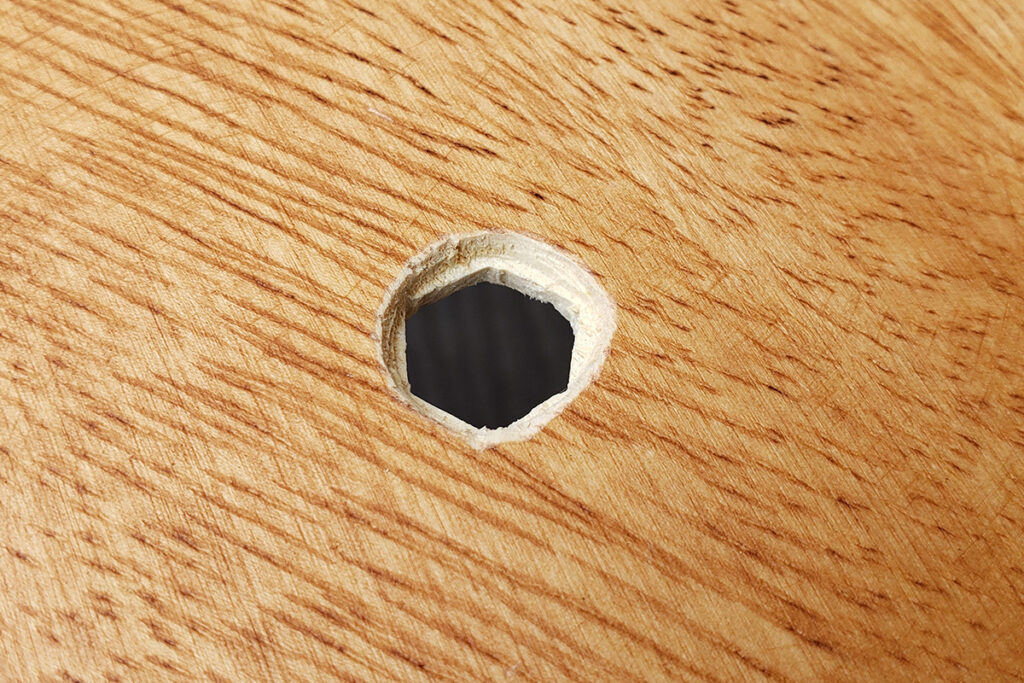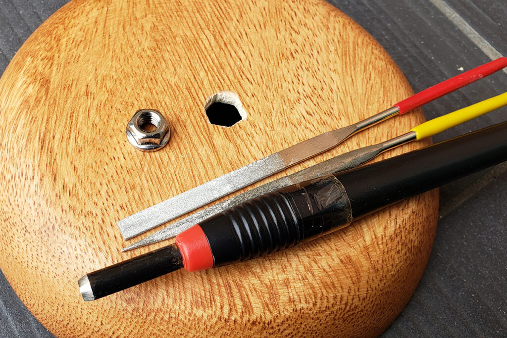 次に、フランジナットの円形部分の高さ分、円形に彫り広げます。一気にせず、フランジナットを時折はめながら、浮いてしまう部分を少しずつ彫るのがポイントです。