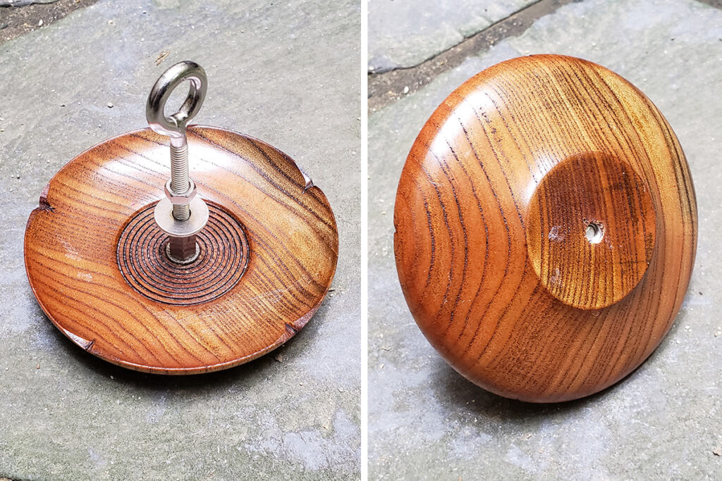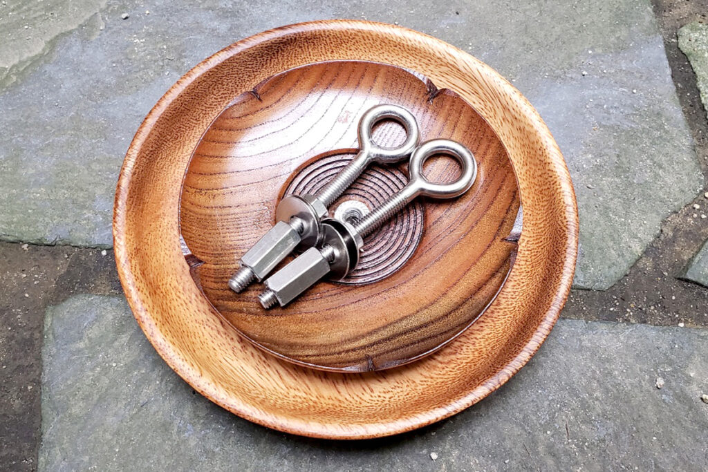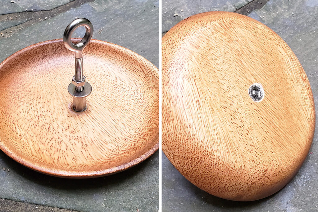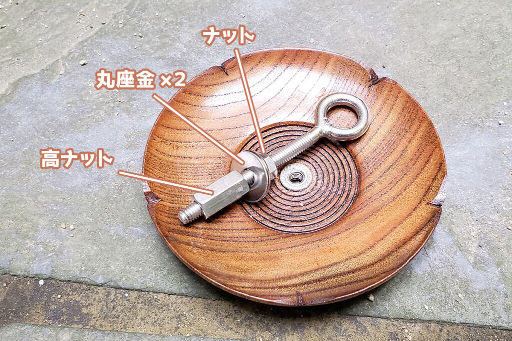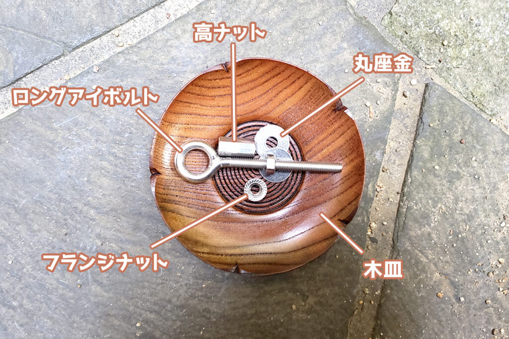 そのロングボルトを、木皿にはめたフランジナットにセットして完成です。